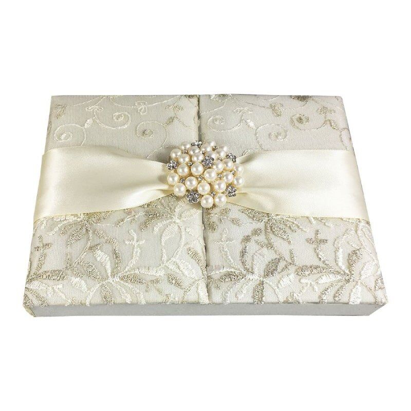This exquisite wedding invitation box, adorned with embroidered lace fabric and a stunning pearl rhinestone brooch, exudes timeless elegance.