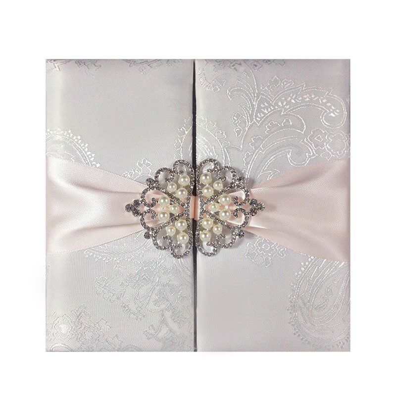 Exquisite handmade gate folder invitation featuring Italian white brocade silk with floral pattern, padded exterior, and interior pocket. Elegantly embellished with pearl crown rhinestone brooches and blush pink double-faced satin ribbon. Perfect for weddings, formal events, and baby showers.